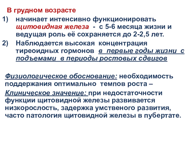 Клиническое значение: при недостаточности функции щитовидной железы развивается низкорослость, задержка умственого развития, часто патология щитовидной железы в пубертате.