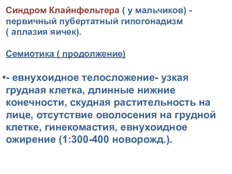 Слайд 59Синдром Клайнфельтера ( у мальчиков) - первичный пубертатный гипогонадизм