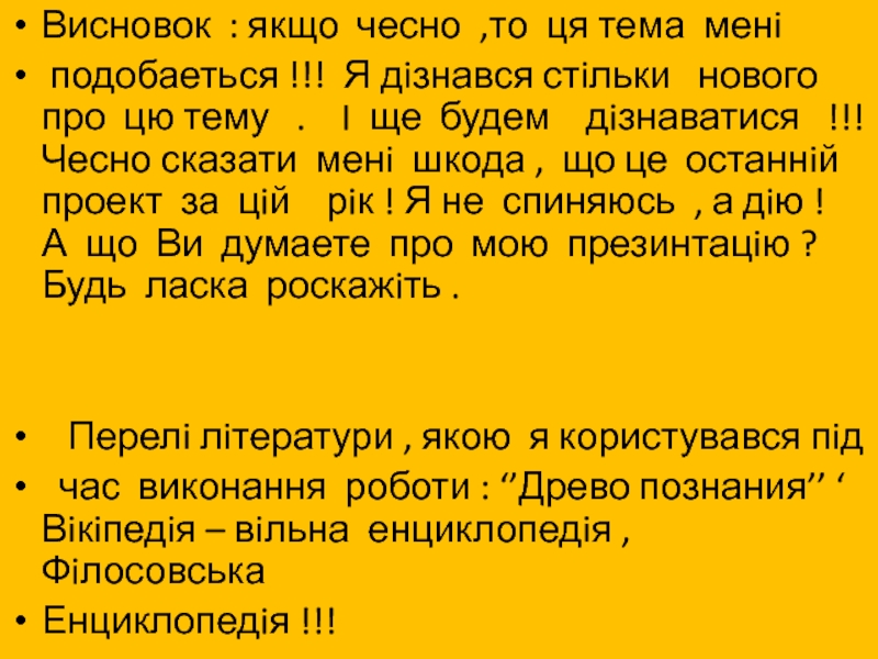 . I ще будем дiзнаватися !!! Чесно сказати менi шкода , що це останнiй проект за цiй рiк ! Я не спиняюсь , а дiю ! А що Ви думаете про мою презинтацiю ? Будь ласка роскажiть .