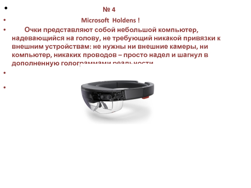 Очки представляют собой небольшой компьютер, надевающийся на голову, не требующий никакой привязки к внешним устройствам: не нужны ни внешние камеры, ни компьютер, никаких проводов – просто надел и шагнул в дополненную голограммами реальности.