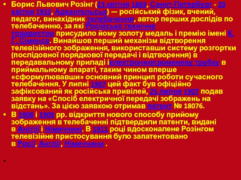 Слайд 7Борис Львович Розінг (23 квітня 1869, Санкт-Петербург - 20 квітня 1933, Архангельськ) — російський фізик, вчений, педагог,