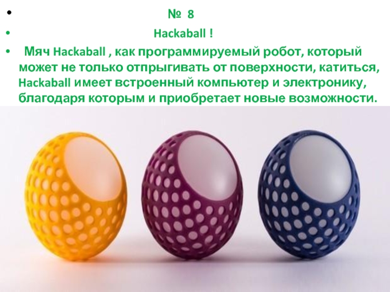 Мяч Hackaball , как программируемый робот, который может не только отпрыгивать от поверхности, катиться, Hackaball имеет встроенный компьютер и электронику, благодаря которым и приобретает новые возможности.