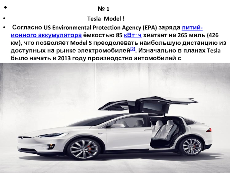 Согласно US Environmental Protection Agency (EPA) заряда литий-ионного аккумулятора ёмкостью 85 кВт⋅ч хватает на 265 миль (426 км), что позволяет Model S преодолевать наибольшую дистанцию из доступных на рынке электромобилей[2]. Изначально в планах Tesla было начать в 2013 году производство автомобилей с аккумуляторами ёмкостью 60 кВт⋅ч (335 км) .