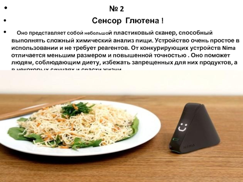 Оно представляет собой небольшой пластиковый сканер, способный выполнять сложный химический анализ пищи. Устройство очень простое в использовании и не требует реагентов. От конкурирующих устройств Nima отличается меньшим размером и повышенной точностью . Оно поможет людям, соблюдающим диету, избежать запрещенных для них продуктов, а в некоторых случаях и спасти жизни.