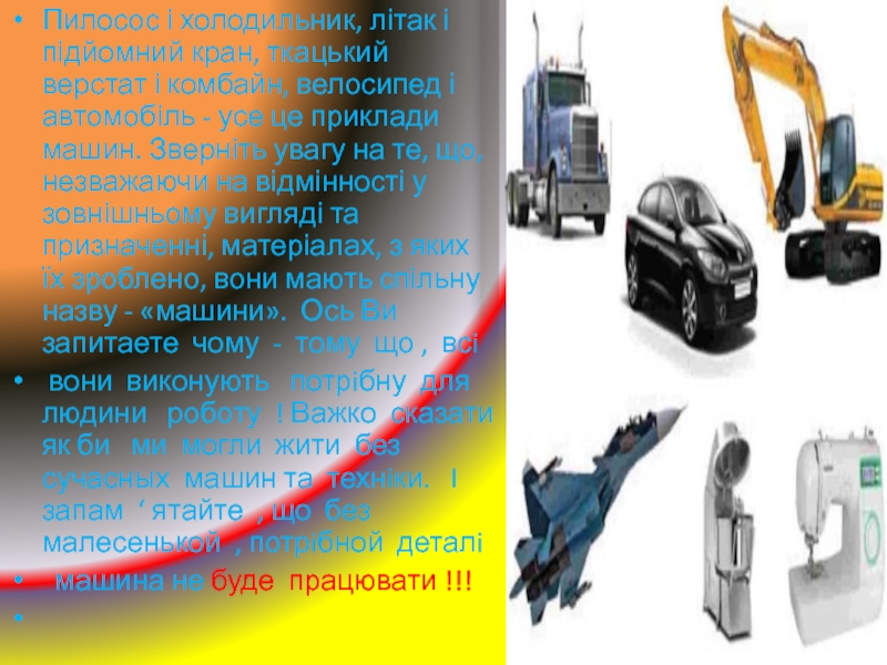 увагу на те, що, незважаючи на відмінності у зовнішньому вигляді та призначенні, матеріалах, з яких їх зроблено, вони мають спільну назву - «машини». Ось Ви запитаете чому - тому що , всi
