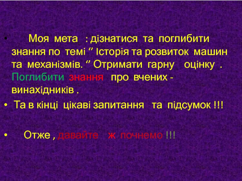 механiзмiв. ‘’ Отримати гарну оцiнку . Поглибити знання про вчених - винахiдникiв .