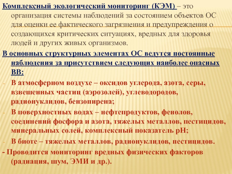Мониторинг окружающей среды – система непрерывно выполняемых по заданной программе регулярных комплексных долгосрочных наблюдений за состоянием ОС, ее загрязнением, происходящими природными явлениями, анализ результатов наблюдений, а также оценка и прогноз последующих изменений.
