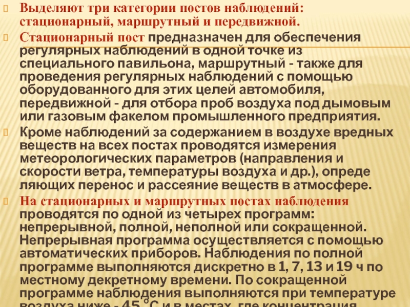 павильона, маршрутный - также для проведения регулярных наблюдений с помощью оборудованного для этих целей автомобиля, передвижной - для отбора проб воздуха под дымовым или газовым факелом промышленного предприятия.