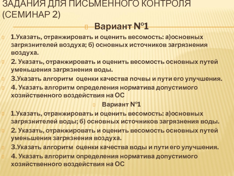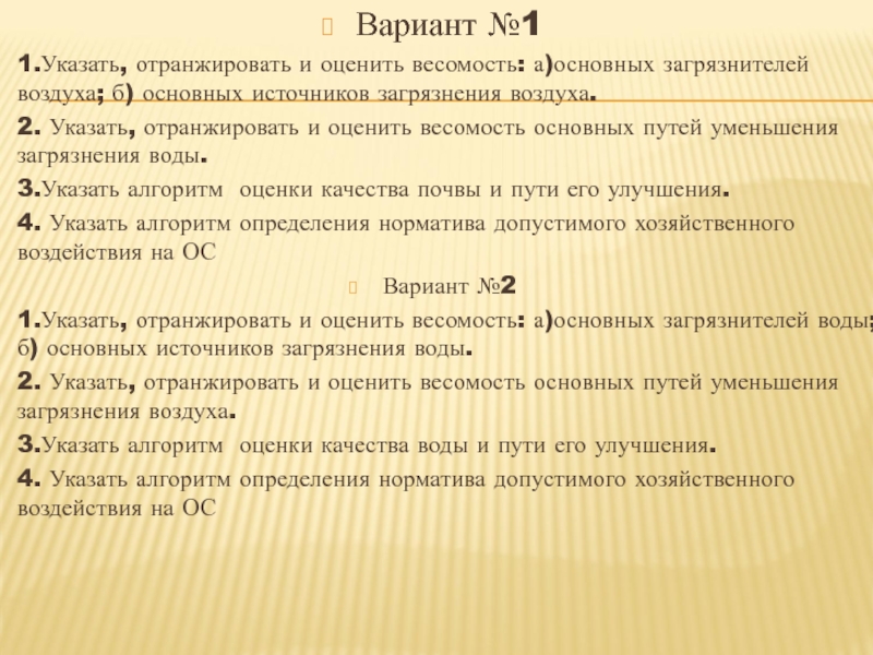 1.Указать, отранжировать и оценить весомость: а)основных загрязнителей воздуха; б)