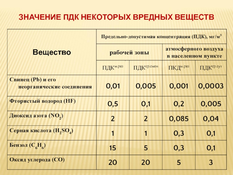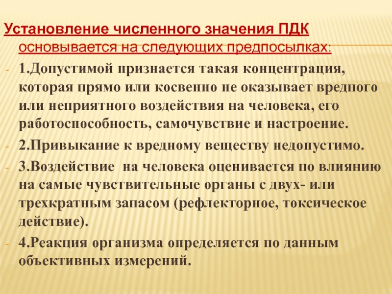 Установление численного значения ПДК основывается на следующих предпосылках:
