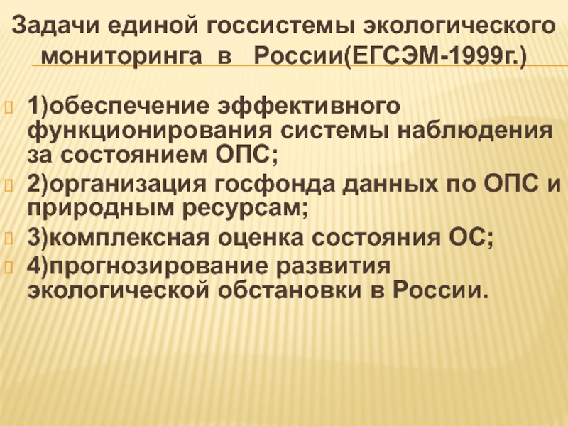 3)контроль состояния ОС, создания и развития моделей изменения отдельных ее компонентов и Земли как единой системы.