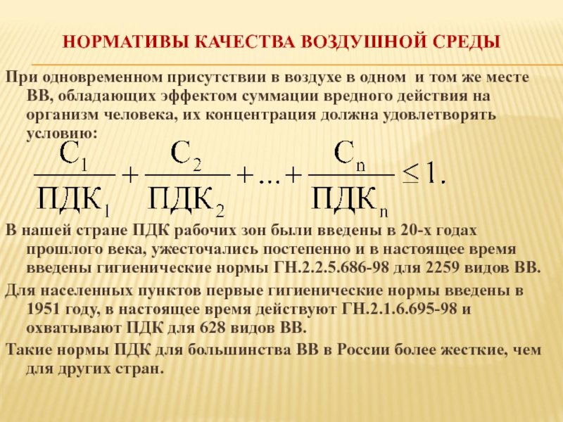 ПДК ВВ в рабочей зоне, в населенных пунктах, нормативы с учетом эффекта суммации