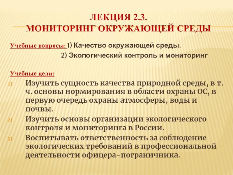 Воспитывать ответственность за соблюдение экологических требований в профессиональной деятельности офицера-пограничника.