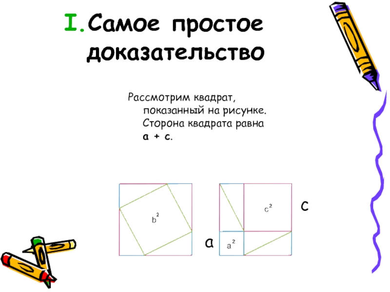 В другом случае (справа) квадрат разбит на два квадрата со сторонами a и c и четыре прямоугольных треугольника с катетами a и c.