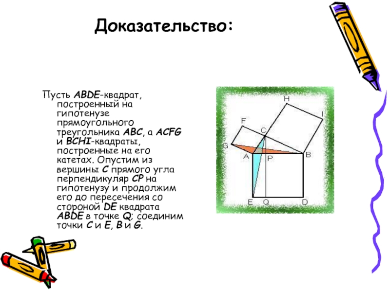Отсюда и из равенства треугольников ACE и GBA вытекает равновеликость прямоугольника QPBD и квадрата CFGA; аналогично доказывается и равновеликость прямоугольника QPAE и квадрата CHIB. А отсюда, следует, что квадрат ABDE равновелик сумме квадратов ACFG и BCHI, т.е. теорема Пифагора.