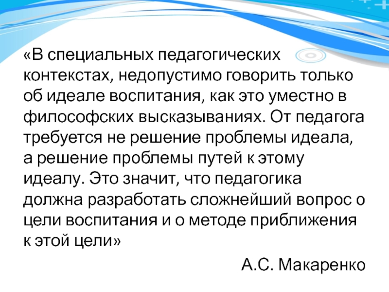 Слайд 18«В специальных педагогических контекстах, недопустимо говорить только об идеале воспитания,