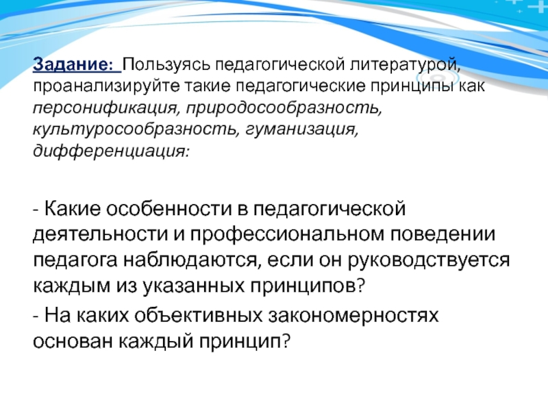 Слайд 26Задание: Пользуясь педагогической литературой, проанализируйте такие педагогические принципы как персонификация,