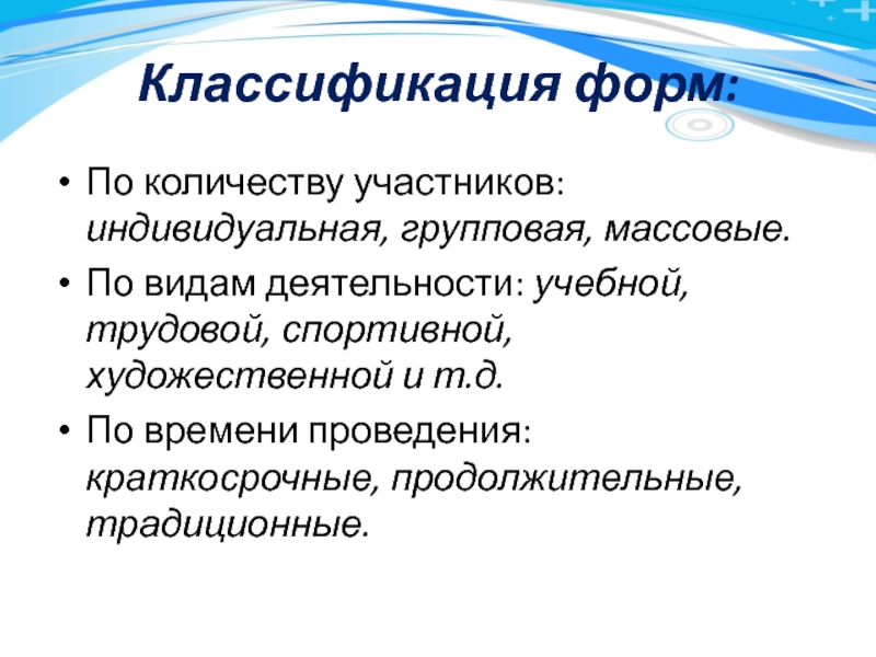 По времени проведения: краткосрочные, продолжительные, традиционные.