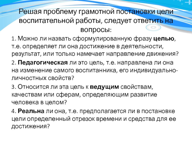 Решая проблему грамотной постановки цели воспитательной работы, следует ответить на