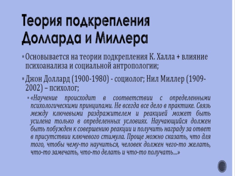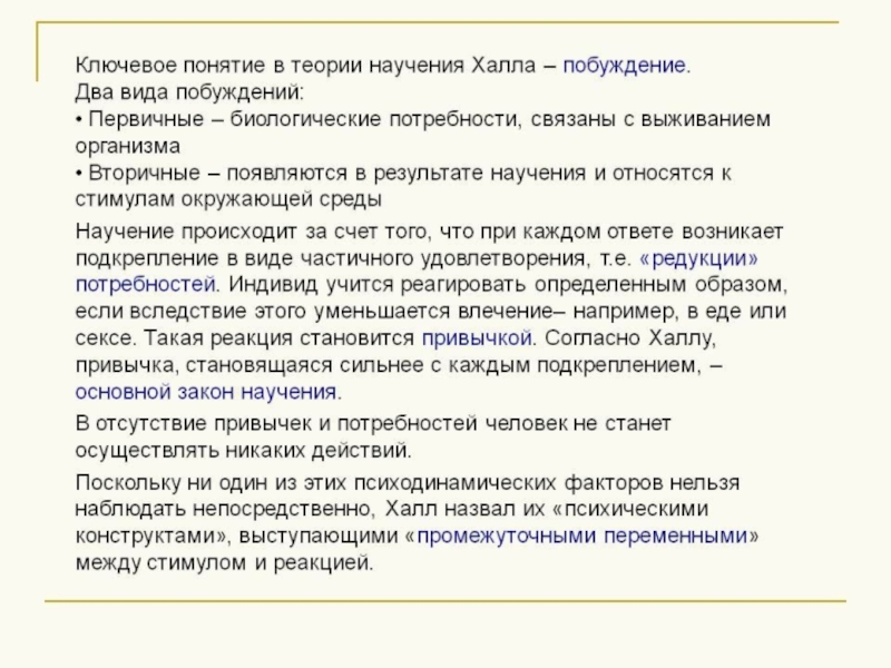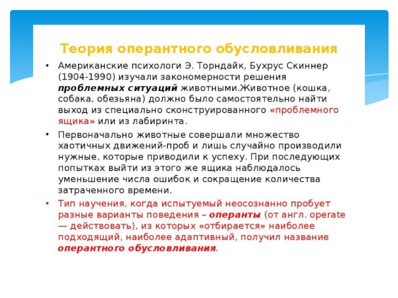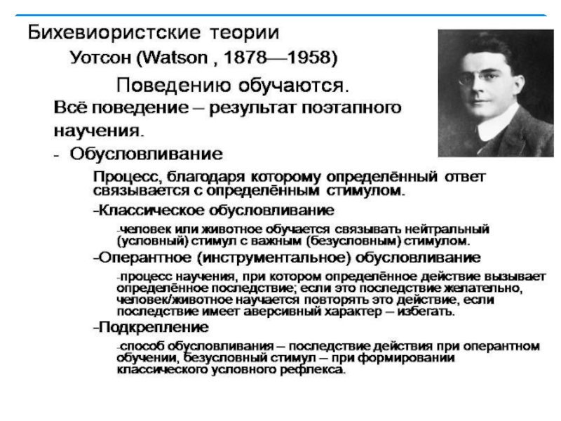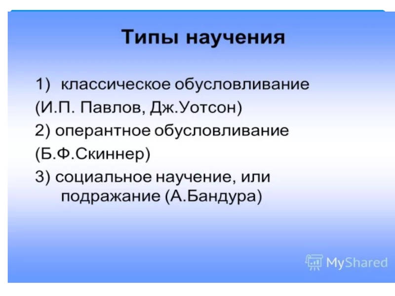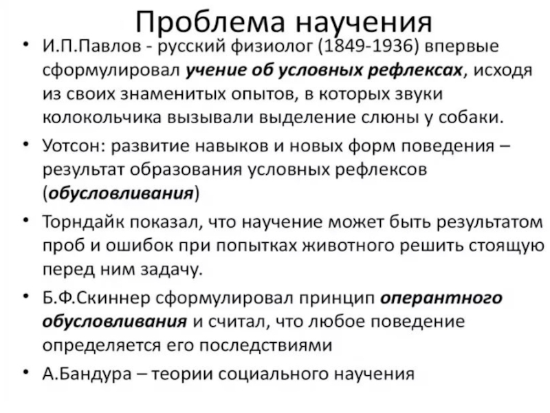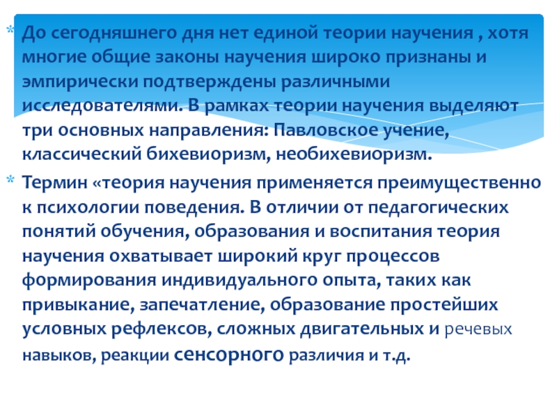 В рамках теории научения выделяют три основных направления: Павловское учение, классический бихевиоризм, необихевиоризм.Термин «теория научения применяется преимущественно к психологии поведения. В отличии от педагогических понятий обучения, образования и воспитания теория научения охватывает широкий круг процессов формирования индивидуального опыта, таких как привыкание, запечатление, образование простейших условных рефлексов, сложных двигательных и речевых навыков, реакции сенсорного различия и т.д.