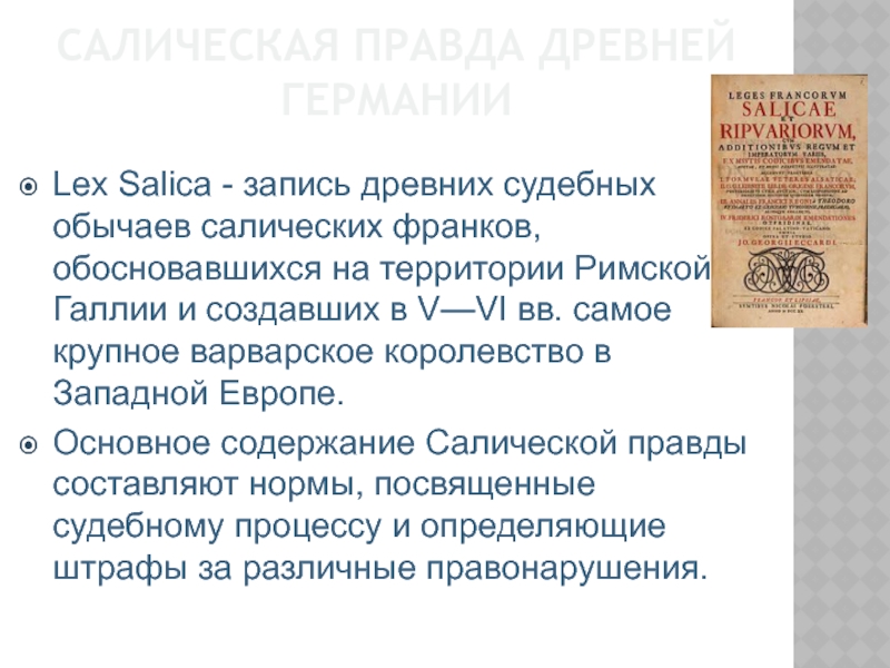 Основное содержание Салической правды составляют нормы, посвященные судебному процессу и определяющие штрафы за различные правонарушения.