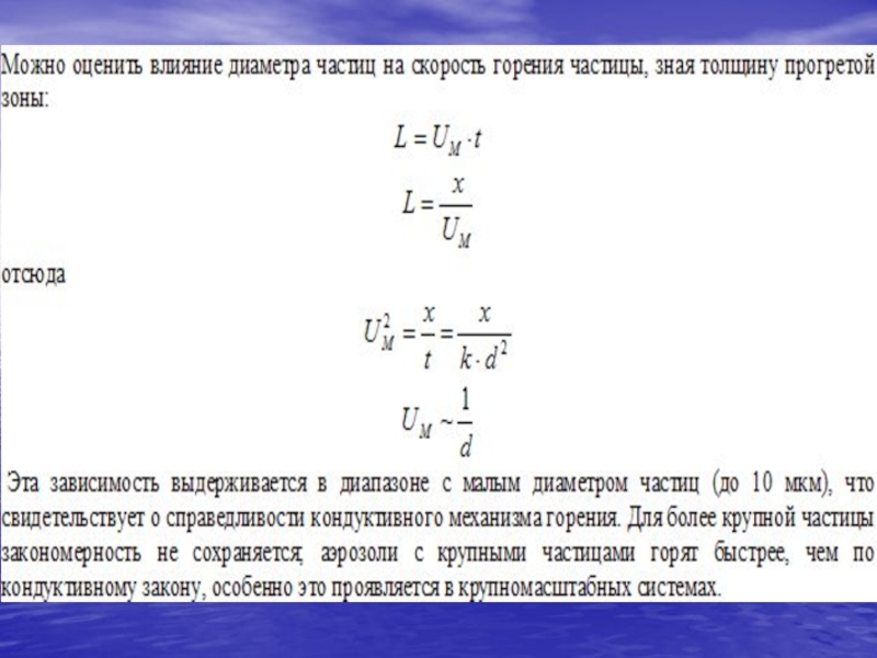 Скорость распространения горения должна зависеть от размеров частиц в существенной мере; частицы, горящие в газовой фазе, горят по закону Средневского: время горения пропорционально квадрату диаметра частиц