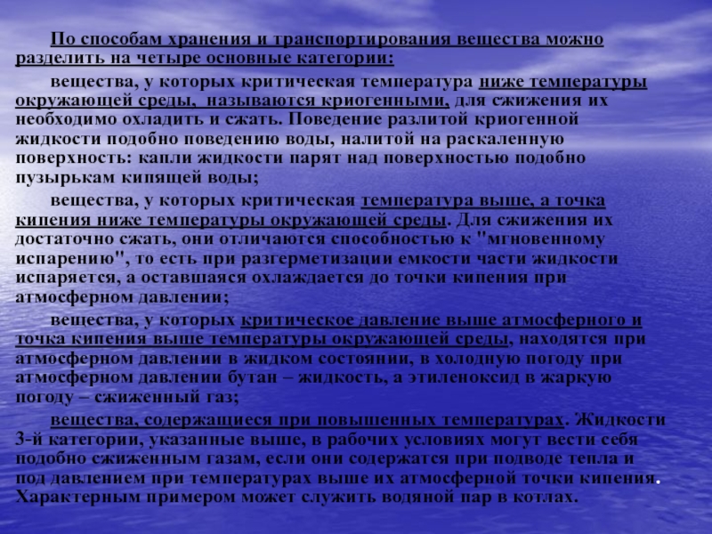 вещества, у которых критическая температура выше, а точка кипения ниже температуры окружающей среды. Для сжижения их достаточно сжать, они отличаются способностью к "мгновенному испарению", то есть при разгерметизации емкости части жидкости испаряется, а оставшаяся охлаждается до точки кипения при атмосферном давлении;