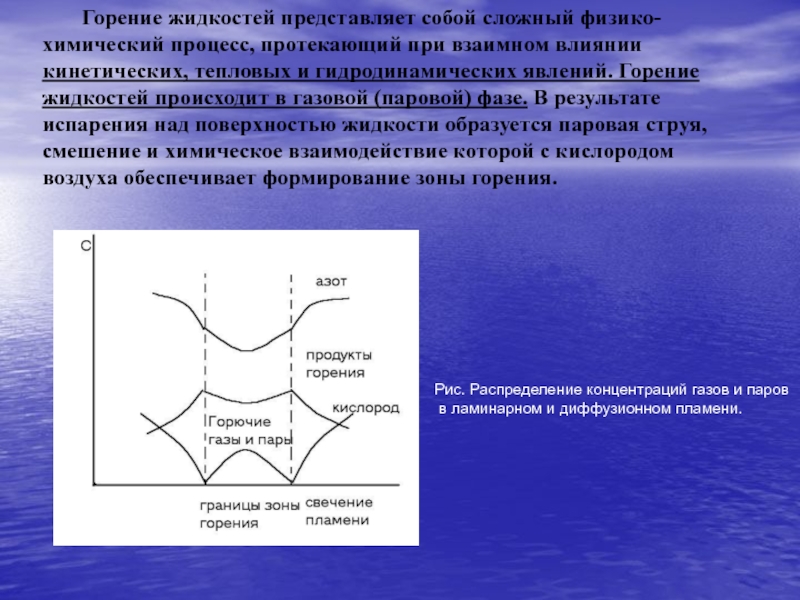 Слайд 3Горение жидкостей представляет собой сложный физико-химический процесс, протекающий при взаимном
