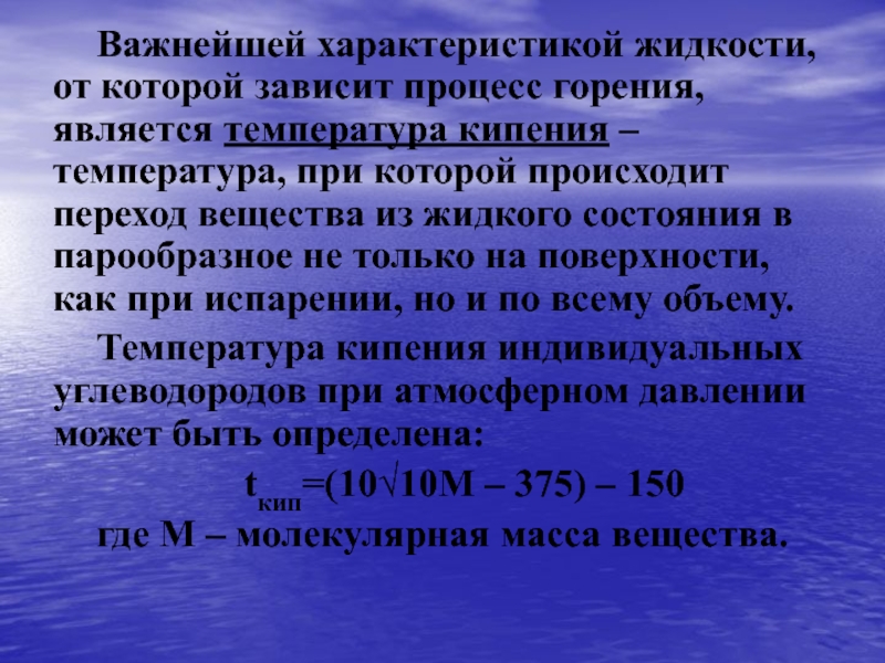 Слайд 4Важнейшей характеристикой жидкости, от которой зависит процесс горения, является температура