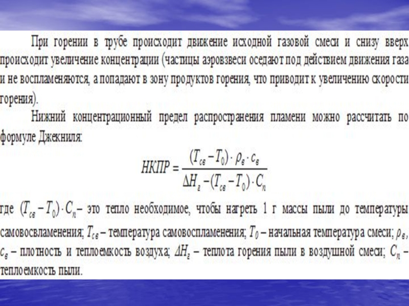предел распространения пламени (НКПР), минимальная энергия зажигания, максимальное давление взрыва, скорость нарастания давления при разрыве, минимальное взрывоопасное содержание кислорода;
