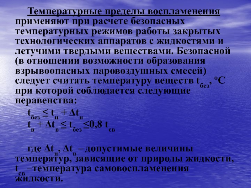 Слайд 5Температурные пределы воспламенения применяют при расчете безопасных температурных режимов работы