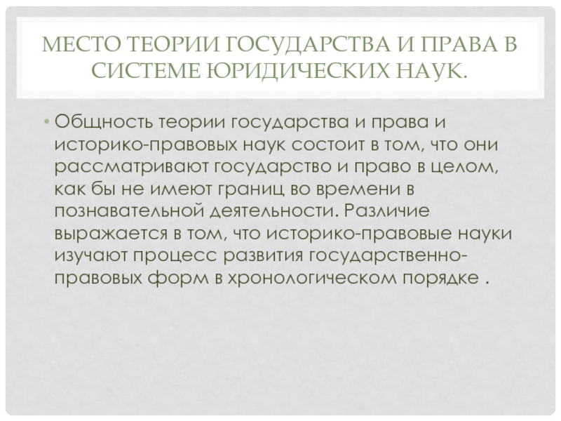 что они рассматривают государство и право в целом, как бы не имеют границ во времени в познавательной деятельности. Различие выражается в том, что историко-правовые науки изучают процесс развития государственно-правовых форм в хронологическом порядке .