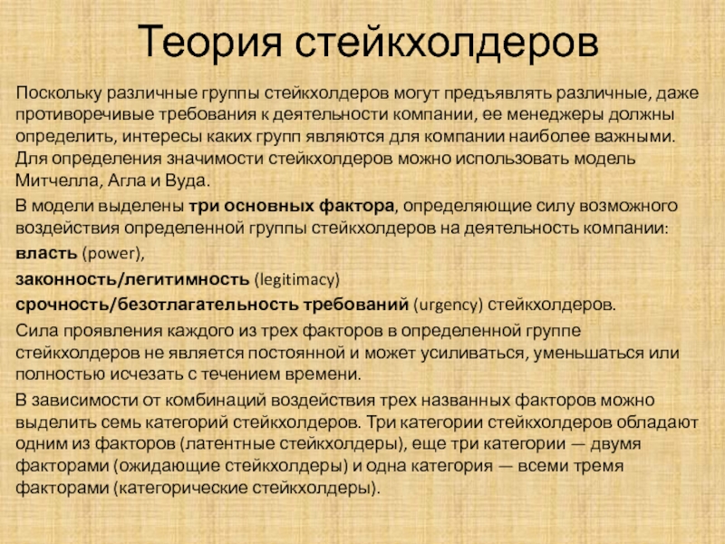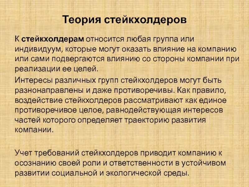 среды, рассматривает предпосылку о единой цели компании, которую принимают и
