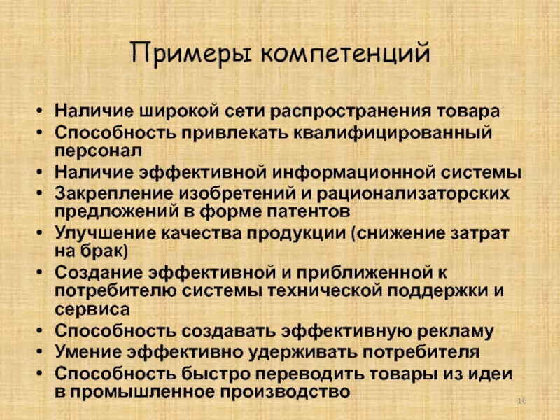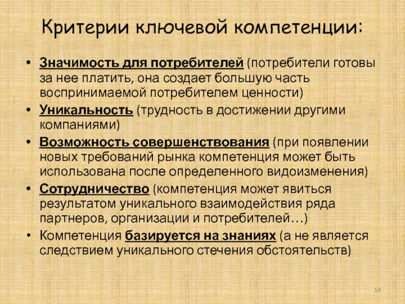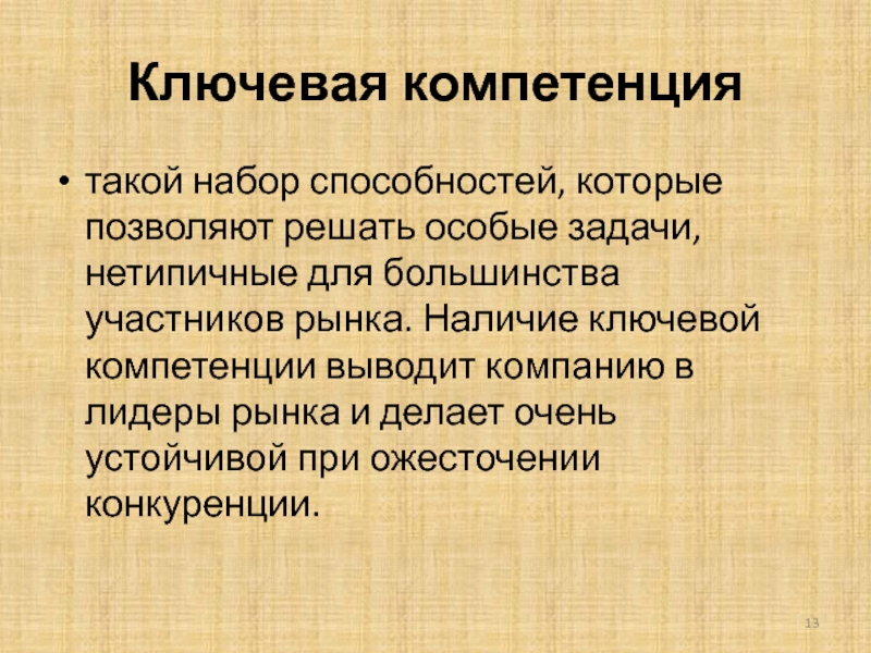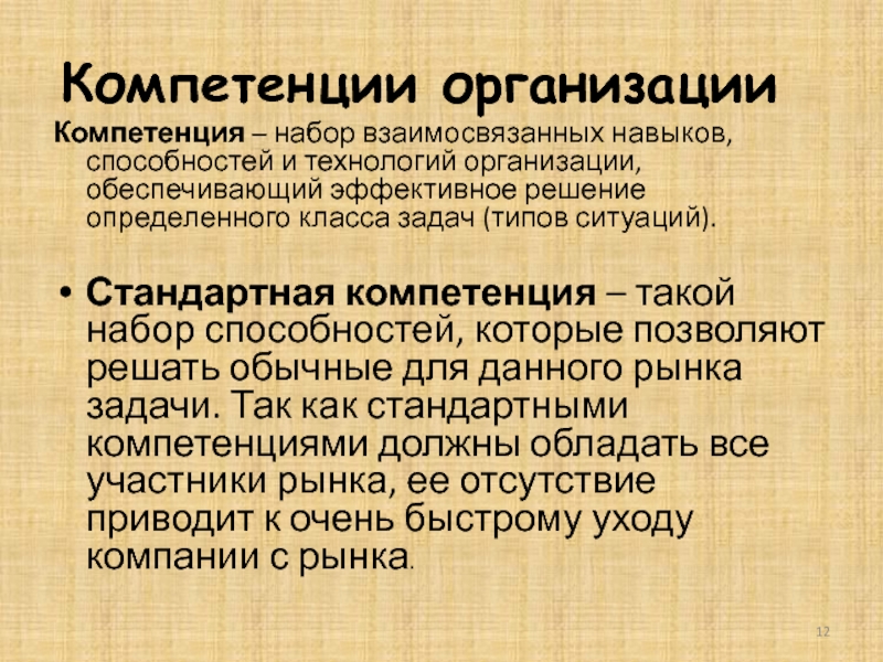 такой набор способностей, которые позволяют решать обычные для данного рынка задачи. Так как стандартными компетенциями должны обладать все участники рынка, ее отсутствие приводит к очень быстрому уходу компании с рынка.