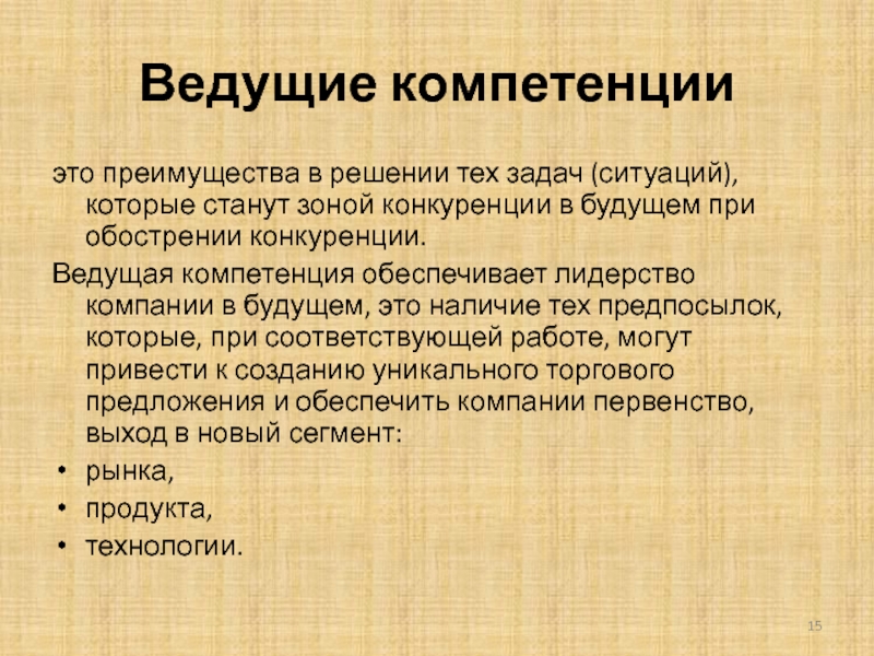 для большинства участников рынка. Наличие ключевой компетенции выводит компанию в
