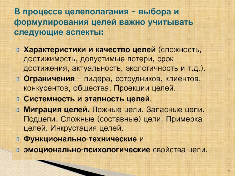 В процессе целеполагания – выбора и формулирования целей важно учитывать следующие аспекты: