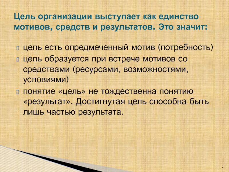 Цель организации выступает как единство мотивов, средств и результатов. Это значит: