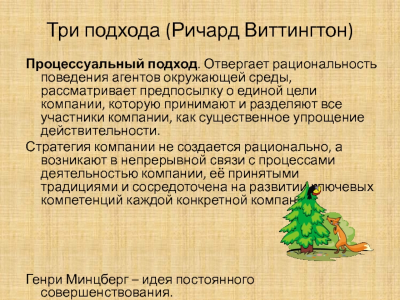 Стратегия компании не создается рационально, а возникают в непрерывной связи с процессами деятельностью компании, её принятыми традициями и сосредоточена на развитии ключевых компетенций каждой конкретной компании.