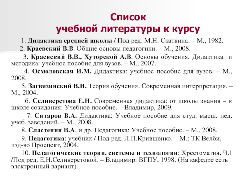 4. Осмоловская И.М. Дидактика: учебное пособие для вузов. – М., 2008.