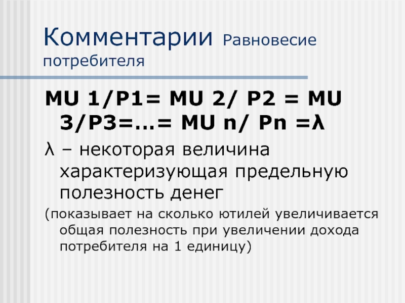 (показывает на сколько ютилей увеличивается общая полезность при увеличении дохода потребителя на 1 единицу)