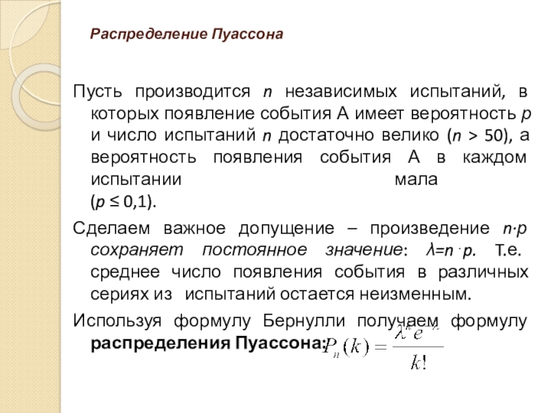 (n > 50), а вероятность появления события А в каждом испытании мала
