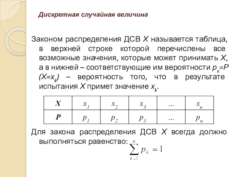 а в нижней – соответствующие им вероятности рк=Р(Х=хk) – вероятность того, что в результате испытания Х примет значение хk.
