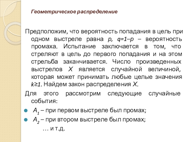 что стреляют в цель до первого попадания и на этом стрельба заканчивается. Число произведенных выстрелов Х является случайной величиной, которая может принимать любые целые значения k1. Найдем закон распределения Х.