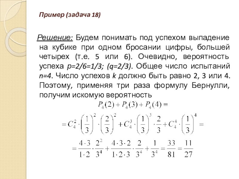 6). Очевидно, вероятность успеха р=2/6=1/3; (q=2/3). Общее число испытаний n=4. Число успехов k должно быть равно 2, 3 или 4. Поэтому, применяя три раза формулу Бернулли, получим искомую вероятность