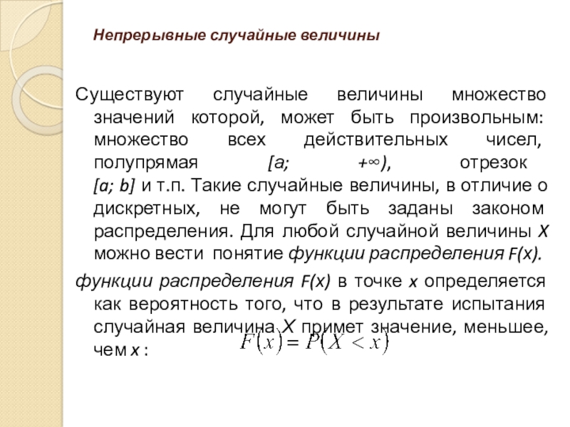b] и т.п. Такие случайные величины, в отличие о дискретных, не могут быть заданы законом распределения. Для любой случайной величины X можно вести понятие функции распределения F(х).