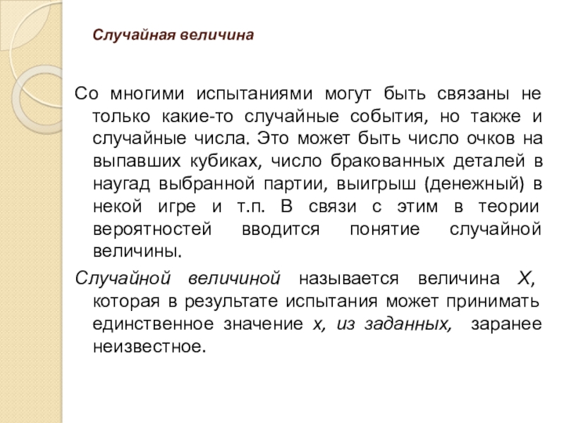 число очков на выпавших кубиках, число бракованных деталей в наугад выбранной партии, выигрыш (денежный) в некой игре и т.п. В связи с этим в теории вероятностей вводится понятие случайной величины.