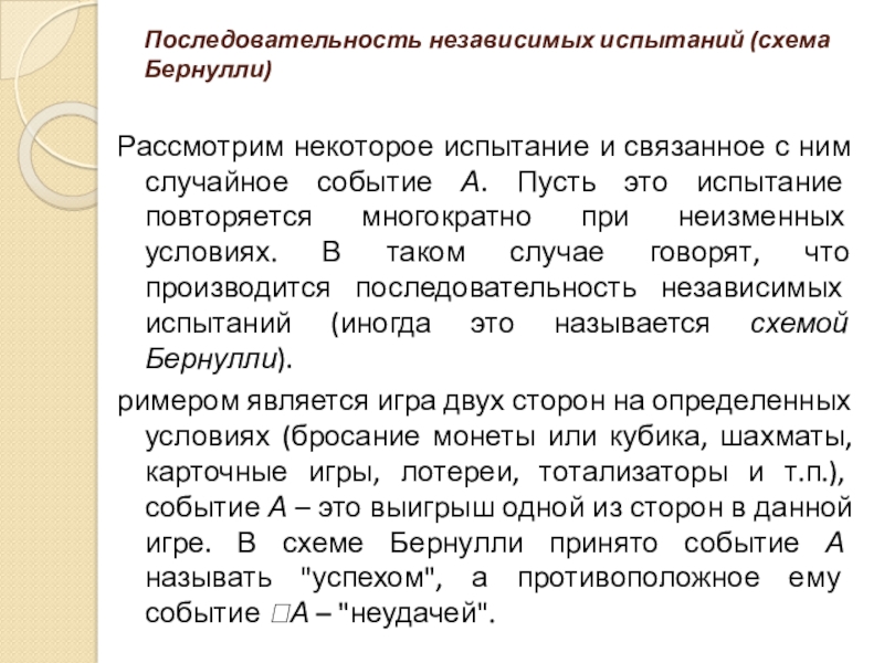 Слайд 8Последовательность независимых испытаний (схема Бернулли)