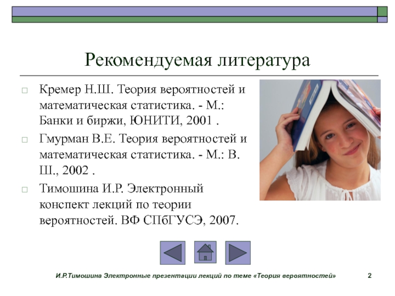 Слайд 2И.Р.Тимошина Электронные презентации лекций по теме «Теория вероятностей»