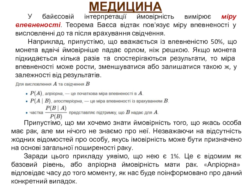 Слайд 54Наприклад, припустімо, що хтось цікавиться, чи має рак певна особа,