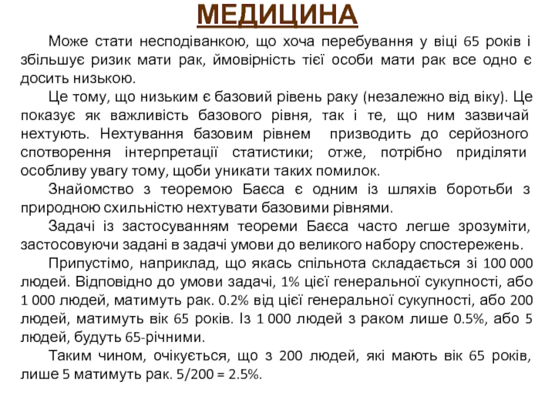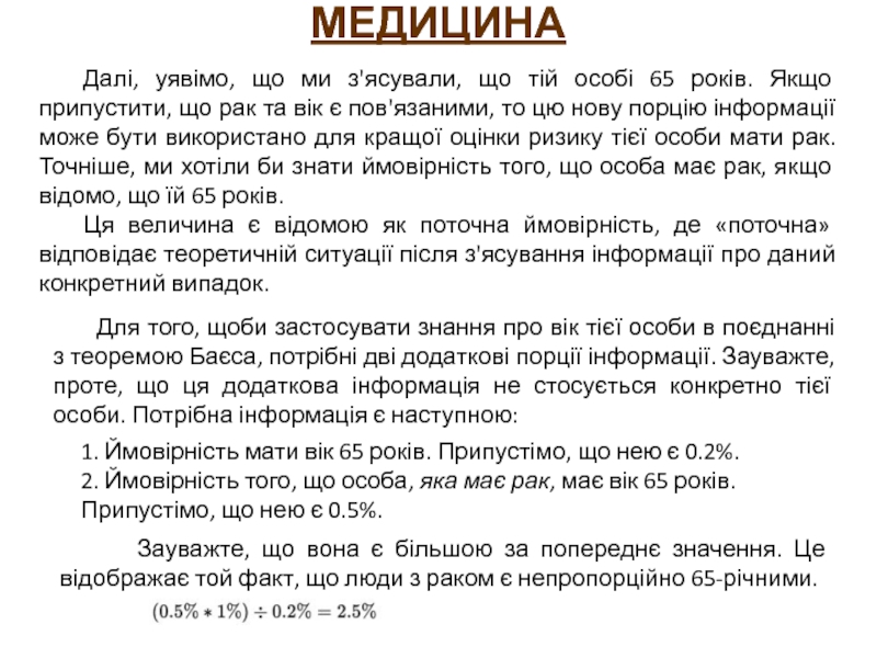 нову порцію інформації може бути використано для кращої оцінки ризику тієї особи мати рак. Точніше, ми хотіли би знати ймовірність того, що особа має рак, якщо відомо, що їй 65 років.